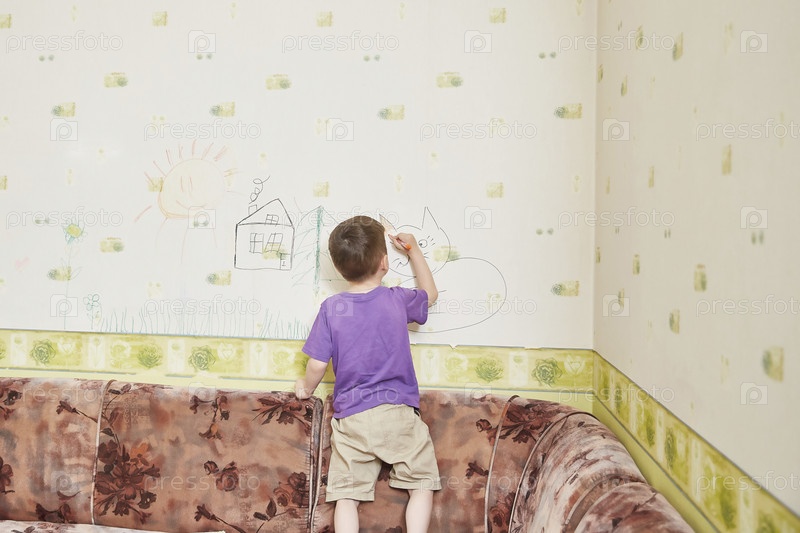 Мальчик рисует на стенах. Ребенок развлекается и пачкает стену
