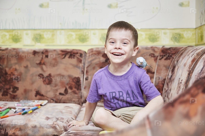 Улыбающийся мальчик сидит на диване в футболке цвета Very Peri
