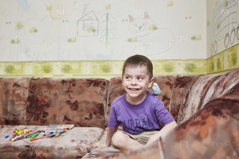 Мальчик играет с попугаем на плечах