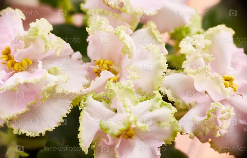 Цветущая кудрявая розовая африканская фиалка. Сенполия. Избирательный фокус