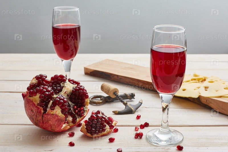 Гранатовое вино на белом деревянном столе. Сыр, штопор