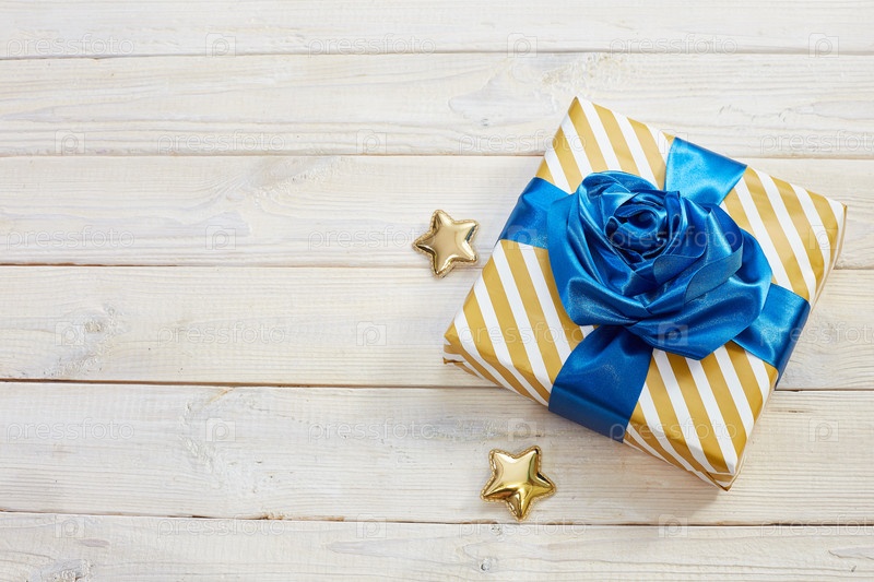 Подарочная коробка с классическими синими бантами. Полосатая обертка, золотые звезды на деревянном фоне. Плоская укладка. Вид сверху