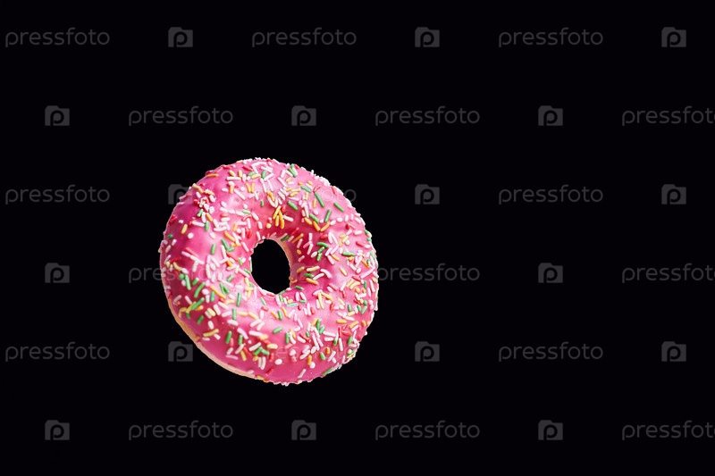 Розовый пончик на черном фоне. Место для текста