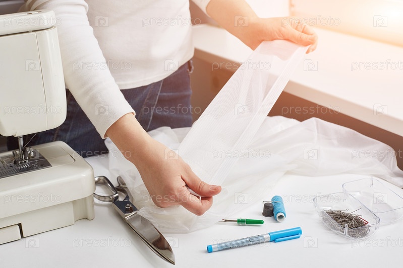 Женские руки портнихи. Девушка расправляет легкую ткань перед шитьем. Швейная машинка и аксессуары на изображении