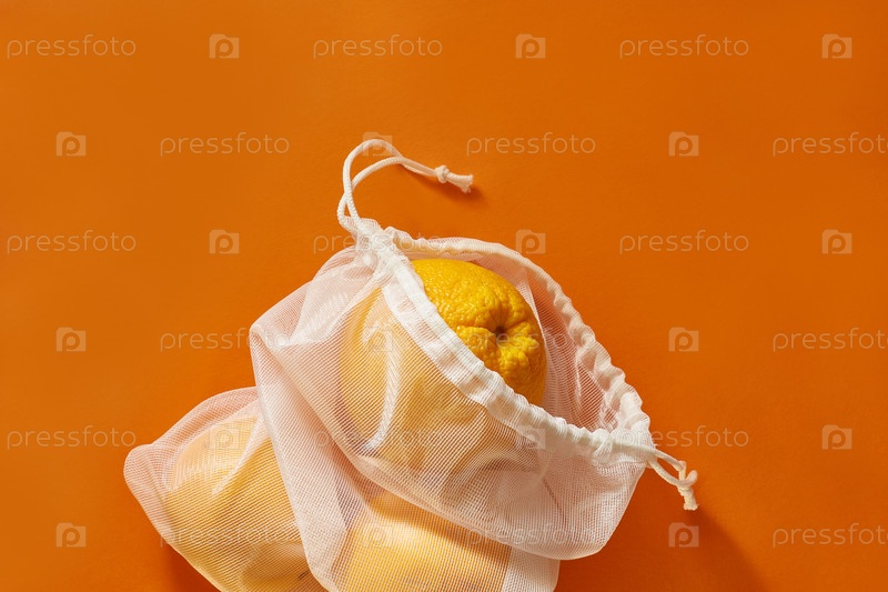 Концепция нулевых отходов. Эко-сумка с апельсинами. Сумка сшита из старой занавески. Пластик бесплатный, экологичная концепция. Многоразовая эко-сумка для покупок
