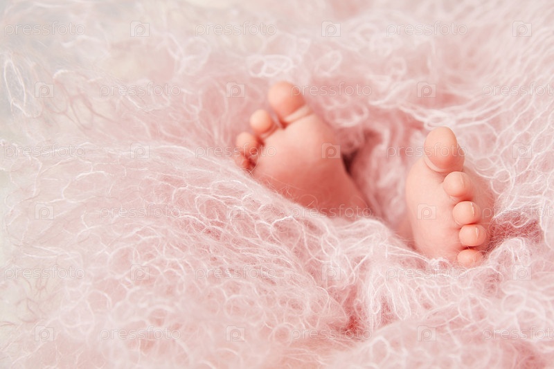 Ножки младенца крупным планом в пушистой вязаной шали. Поздравительная открытка. Концепция семьи