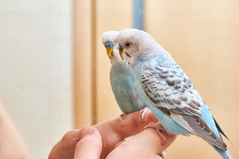 Попугайчик сидит на пальце возле зеркала. Синий попугайчик