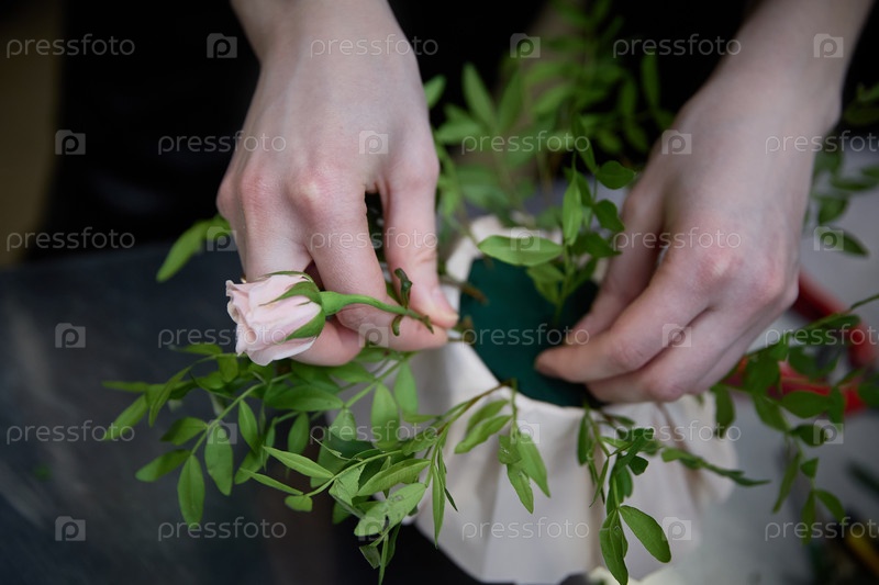 Руки флориста держат розу и втыкают ее в оазис, прессованные водоросли, особое цветочное средство