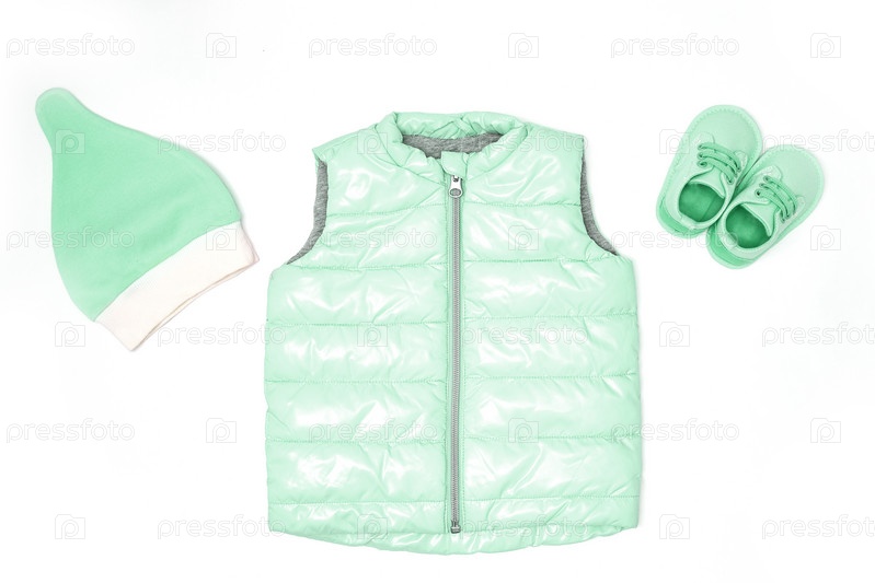 Детская одежда модного цвета. Шапка, обувь, стеганая куртка