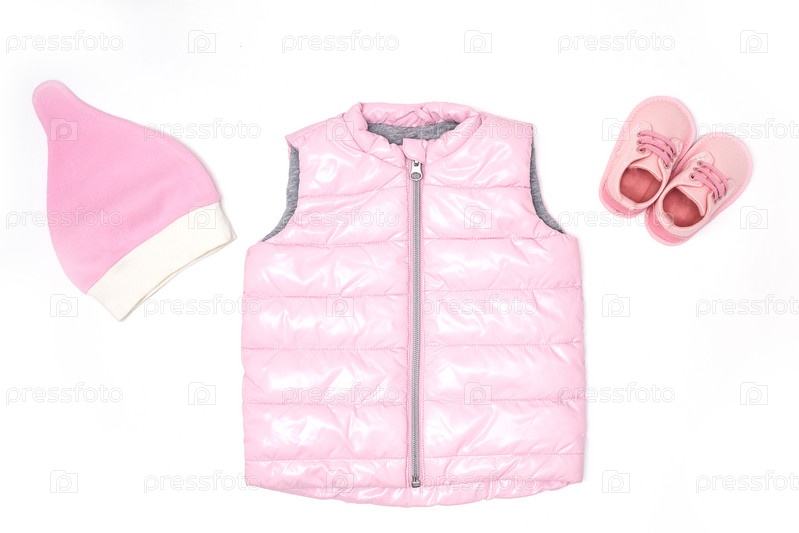 Розовая стеганая куртка, ботинки и шапочка для младенцев. Вид сверху. горизонтальное изображение