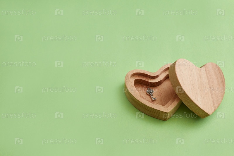 Деревянная коробка. Сердце с ключом. Горизонтальное изображение на зеленом фоне. Фон ко дню святого Валентина
