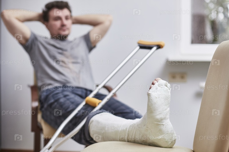 Крупный план гипсовой повязки на ноге молодого человека после травмы во время бега или падения