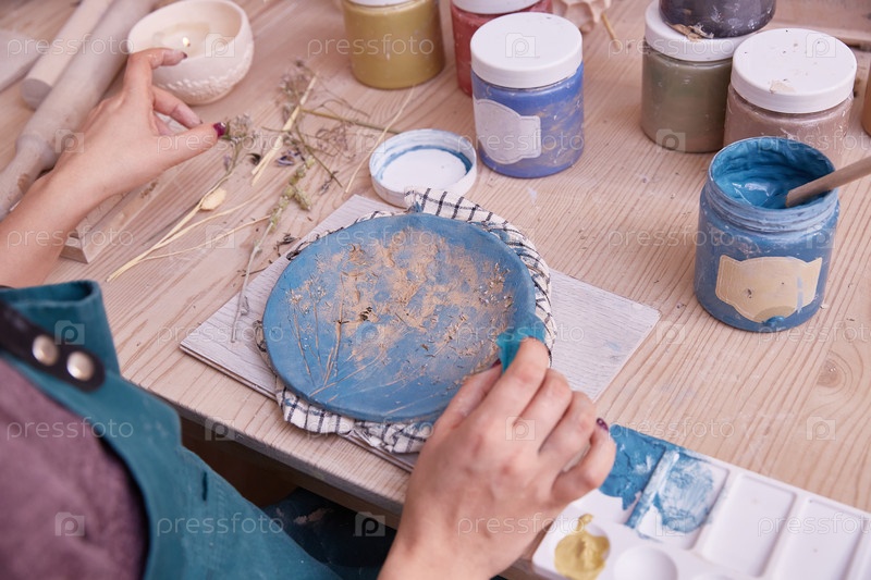 Профессиональный гончар работает над росписью тарелок в мастерской. Женщина-керамист расписывает тарелку синим цветом