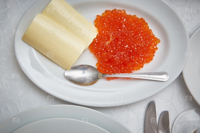 Тарелка с красной кето-икрой и маслом. Крупный план. Образ жизни