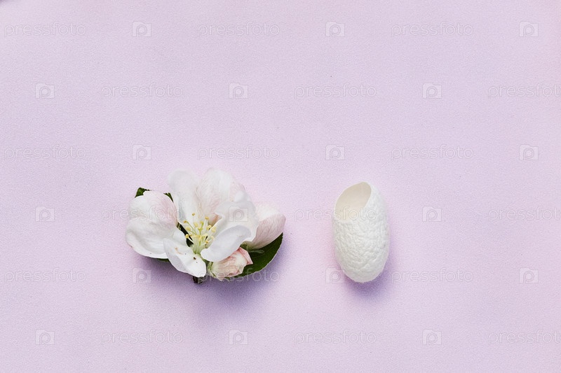Коконы шелкопряда и цветок на розовом фоне, вид сверху, место для копирования