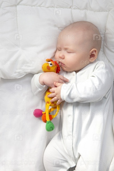Ребенок спит на белом постельном белье. Милый младенец обнимает игрушку жирафа