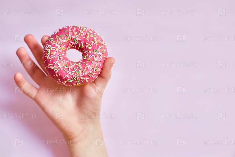 Женская рука держит пончик на розовом фоне. Минимальная плоская планировка