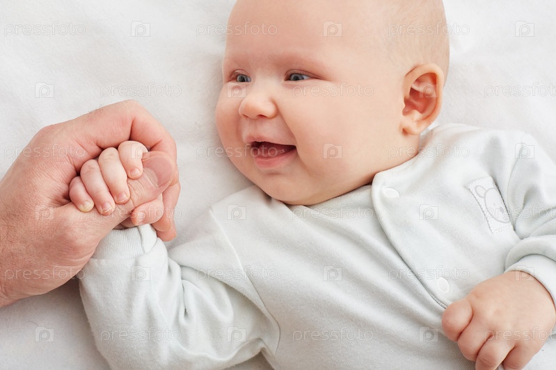 Милый маленький ребенок улыбается и держит папу за руку. концепция любви и семьи