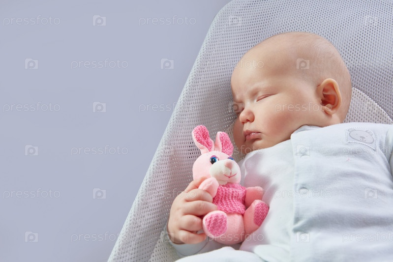 Ребенок спит в шезлонге с розовым кроликом на синем фоне, с местом для текста