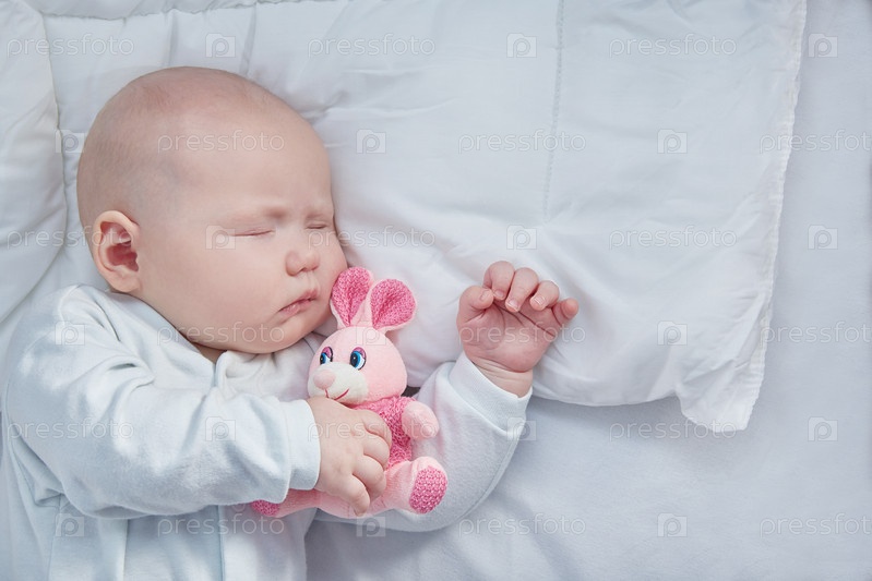 Милый малыш спит со своей игрушкой, вязаной розовым кроликом. Концепция новой семьи и защиты детей. Копировать пространство
