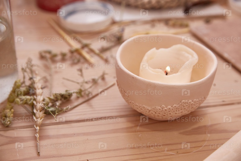 Керамический подсвечник с горящей свечой. керамика