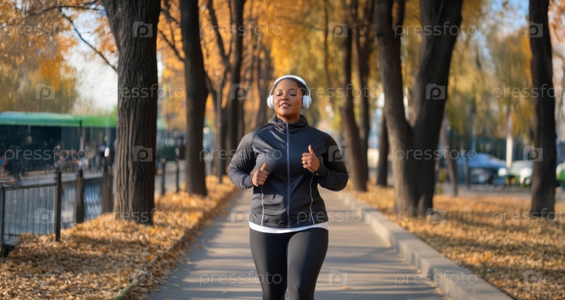 Уставшая африканская женщина размера «плюс» бежит по городскому парку осенним утром с наушниками