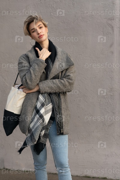 Портрет молодой красивой женщины в сером пальто на улице
