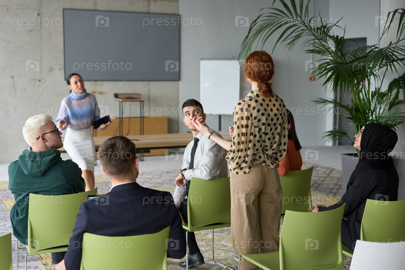 Группа разнообразных деловых людей сосредоточенно сидит в современном офисе, активно участвуя в обучающем занятии под руководством инструктора, уделяя особое внимание последним технологическим достижениям в мире бизнеса