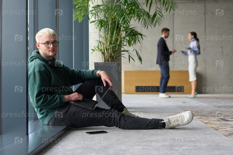Молодой специалист в непринужденной обстановке сидит у большого окна в современном офисе и улыбается, работая на ноутбуке, а его коллеги общаются на размытом фоне