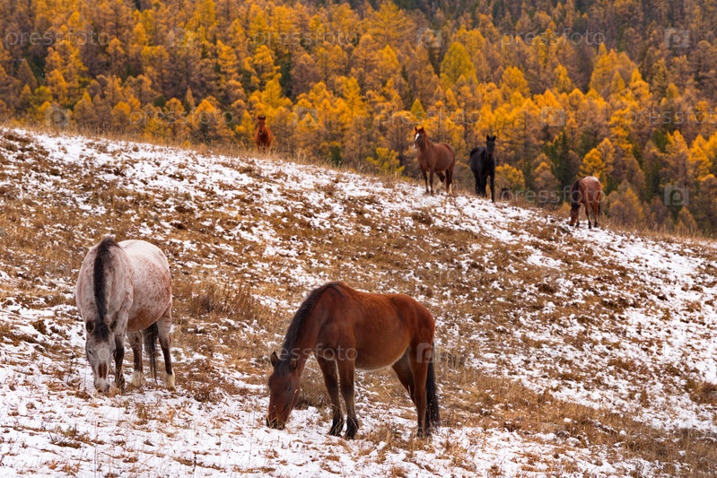 Россия. Юг Западной Сибири, горный Алтай. Небольшой табун лошадей мирно пасется на первом осеннем снегу в окружении желтых лиственниц недалеко от перевала Кату-Ярык