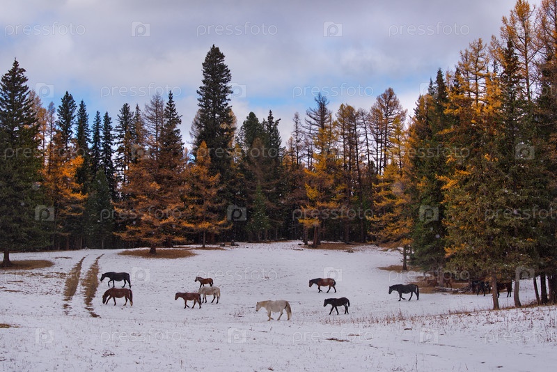 Россия. Юг Западной Сибири, горный Алтай. Небольшой табун лошадей мирно пасется на первом осеннем снегу в окружении желтых лиственниц недалеко от перевала Кату-Ярык