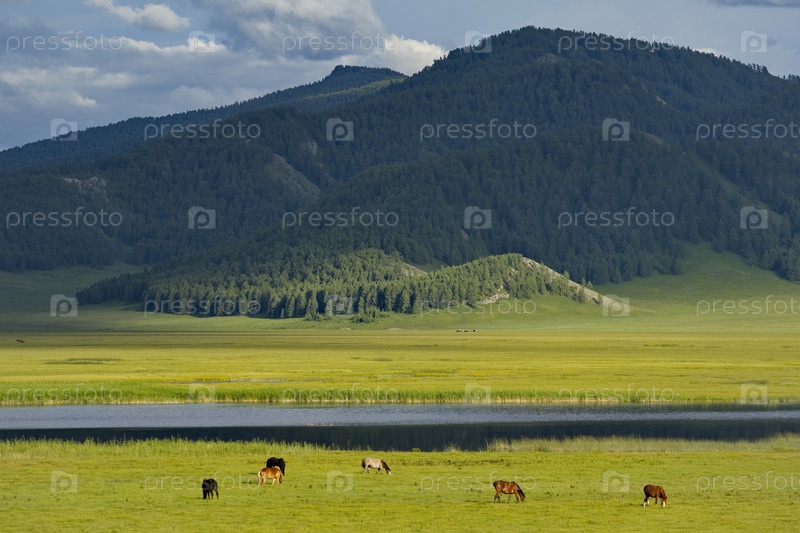Россия. Юг Западной Сибири, горный Алтай. Небольшой табун лошадей мирно пасется на зеленых пастбищах предгорья и долины реки Кан