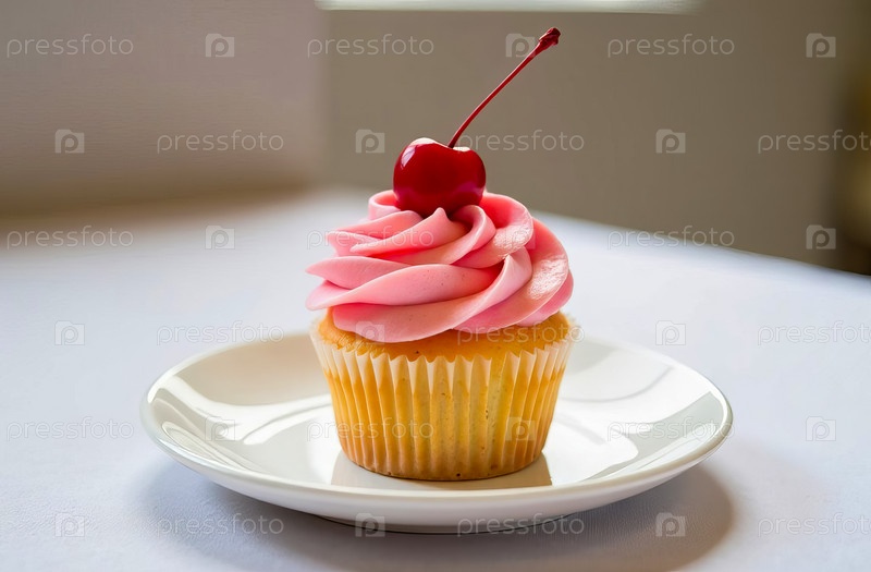 Изысканный кекс с розовой глазурью и вишнями на белой тарелке