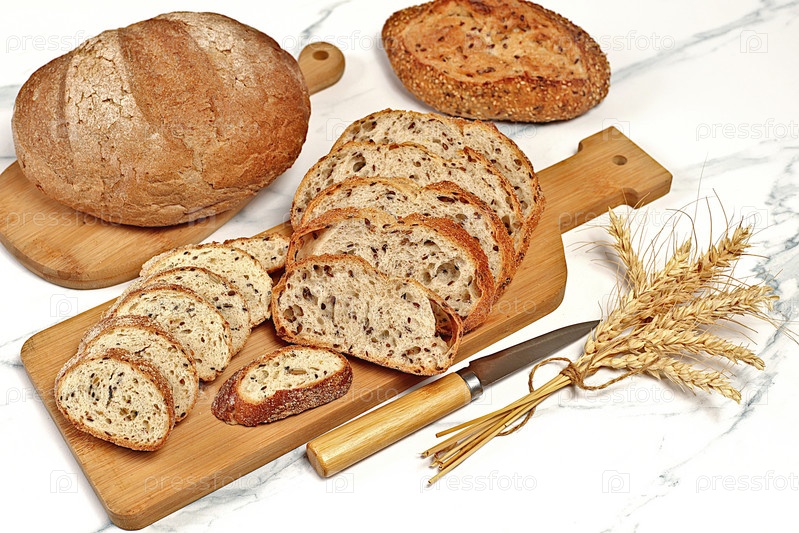 Свежеиспеченный цельнозерновой домашний хлеб на закваске с хрустящей корочкой, нарезанный ломтиками и колосьями пшеницы на мраморном фоне, современная концепция выпечки, здоровая натуральная пища