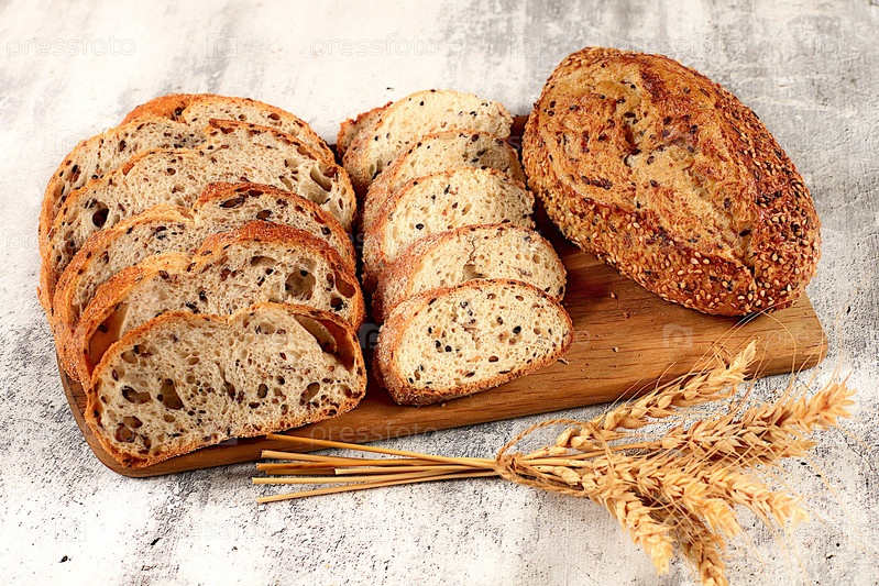 Нарезанный свежеиспеченный цельнозерновой домашний хлеб на закваске с хрустящей корочкой и проросшей пшеницей на бетонном столе, современная концепция выпечки, здоровая натуральная пища