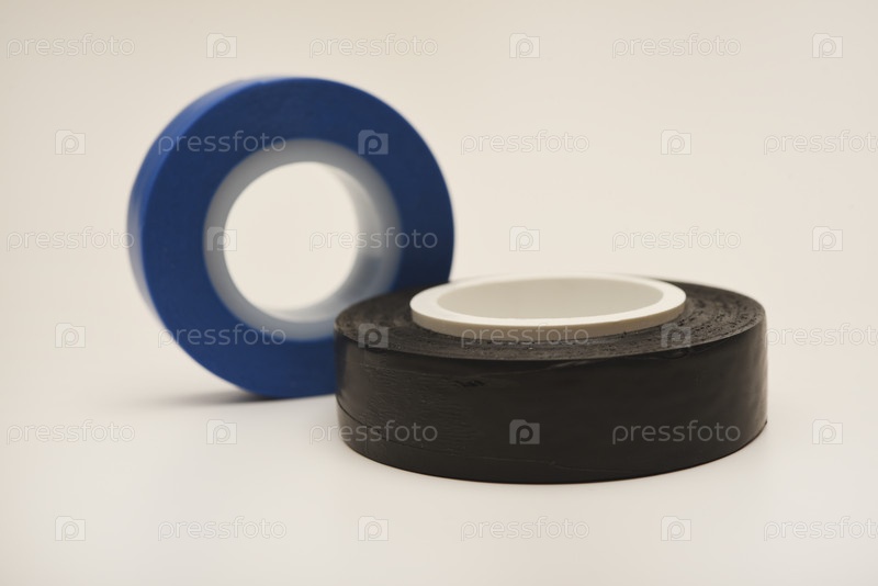 Черная и синяя изолента на белом фоне. Изолента для электроники