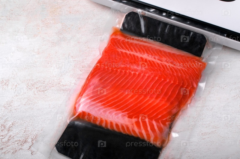 Филе форели холодного копчения в вакуумной упаковке в пластиковом пакете рядом с упаковочной машиной на белом столе. Устройство для вакуумной упаковки