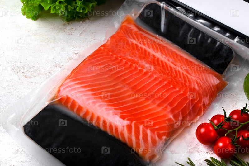 Филе форели холодного копчения в вакуумной упаковке в пластиковом пакете рядом с упаковочной машиной на белом столе. Устройство для вакуумной упаковки