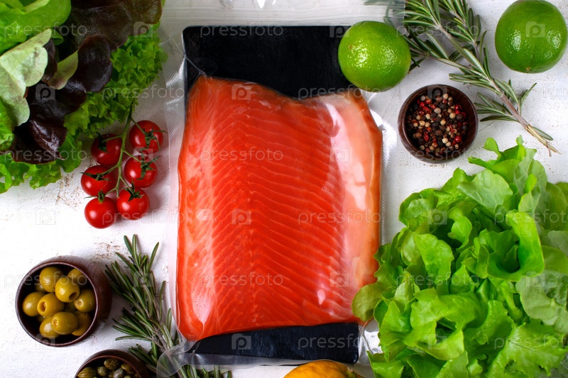 Филе форели холодного копчения в вакуумной упаковке, окруженное другими кулинарными ингредиентами на белом столе