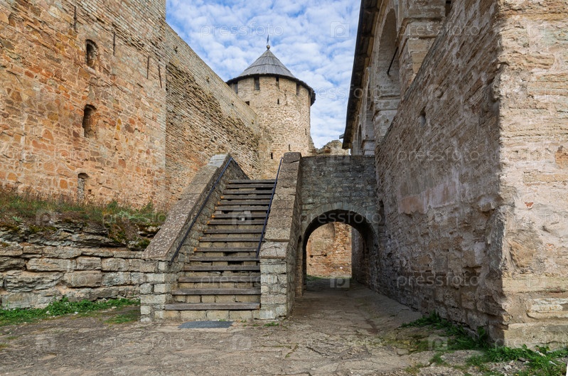 Надвратная башня Ивангородской крепости и лестница Успенской церкви