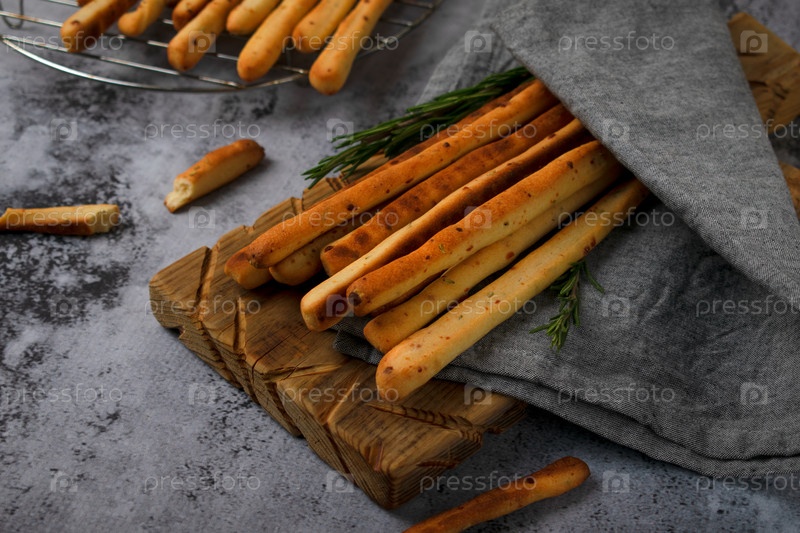 Гриссини из пшеничной муки с пармезаном, розмарином и оливковым маслом. Хлебные палочки на сером фоне. Итальянская хрустящая закуска