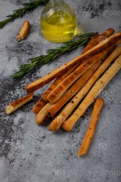 Гриссини из пшеничной муки с пармезаном, розмарином и оливковым маслом. Хлебные палочки на сером фоне. Итальянская хрустящая закуска