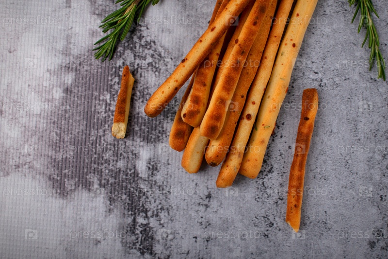 Гриссини из пшеничной муки с пармезаном, розмарином и оливковым маслом. Хлебные палочки на сером фоне. Итальянская хрустящая закуска. Вид сверху