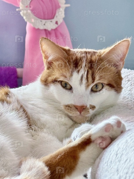 Портрет рыжего кота. Кот лежит на кровати. Крупный план