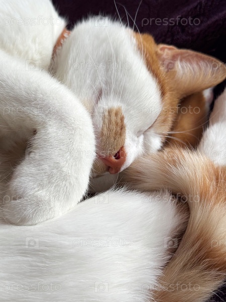 Рыжий кот спит, свернувшись калачиком, обхватив хвостом лапы. Крупный план