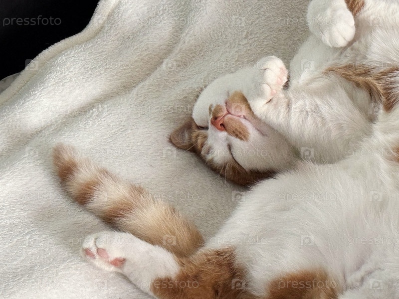 Рыжий кот спит на спине, раскинув лапы. Крупный план. Косой ракурс