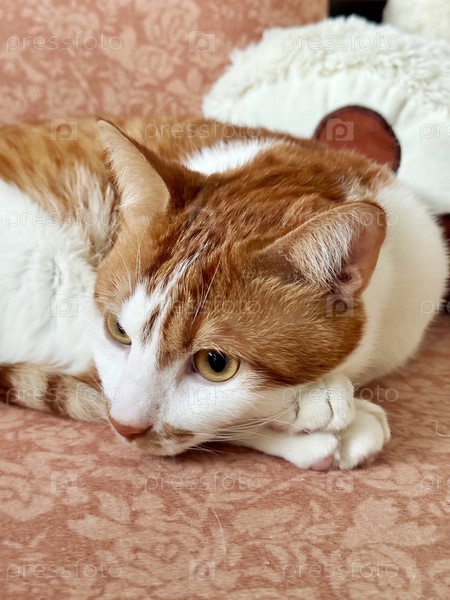 Рыжий кот лежит на диване, положив голову на лапы