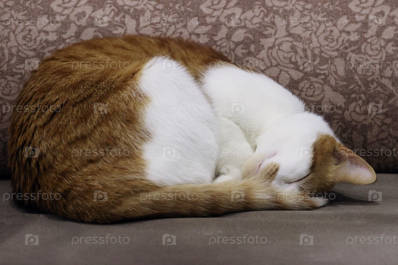 Рыжий кот спит на диване, свернувшись крендельком. Голову положил на лапы. Крупный план