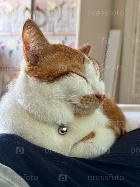 Рыжий кот дремлет у ног хозяина