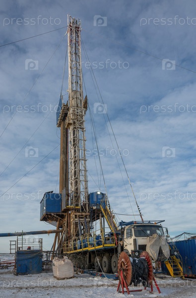 Промышленный зимний пейзаж с работающей буровой установкой и вспомогательными помещениями на удаленной рабочей площадке в светлое время суток